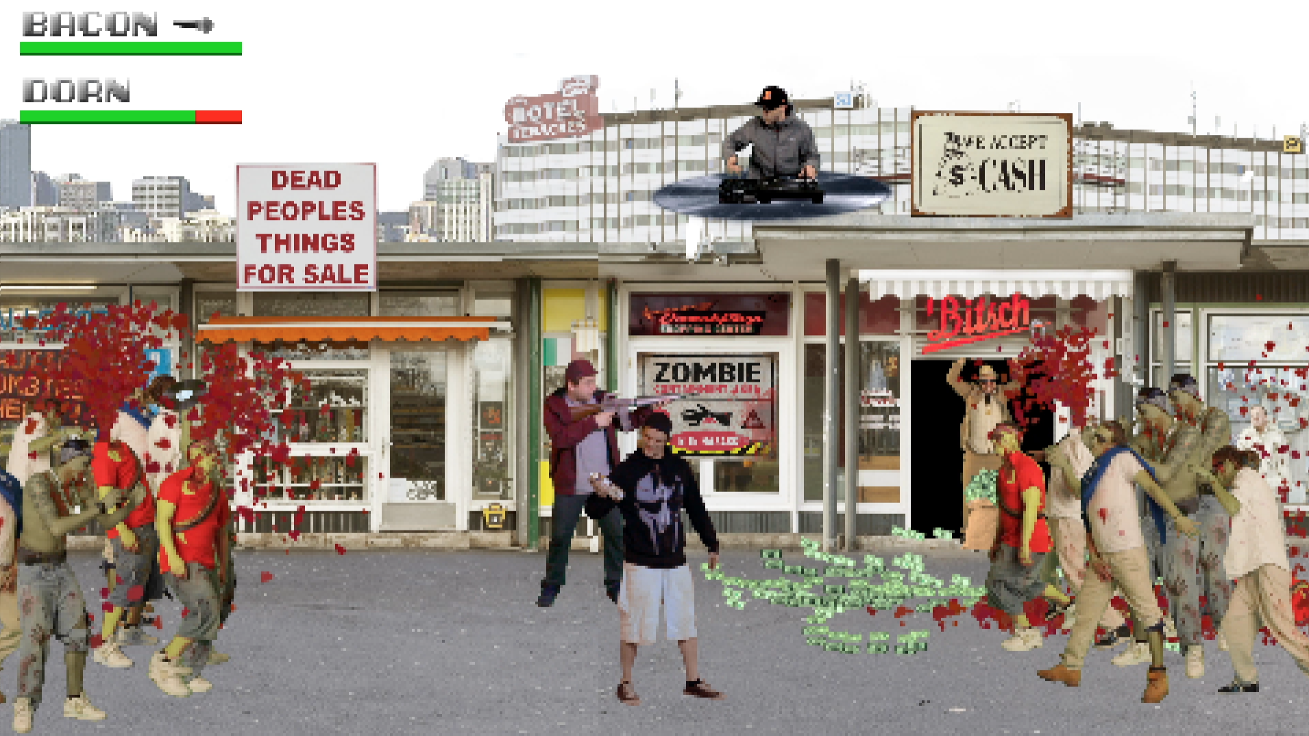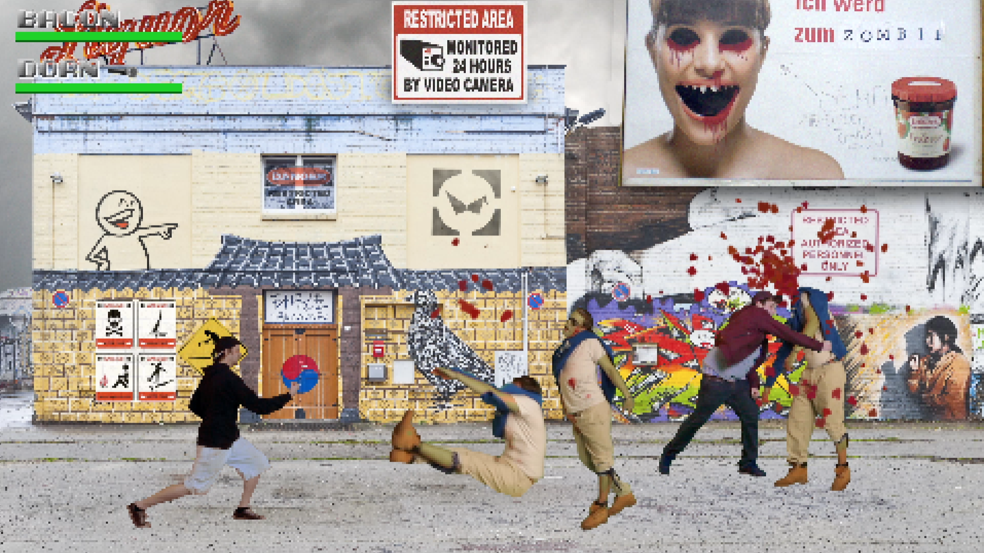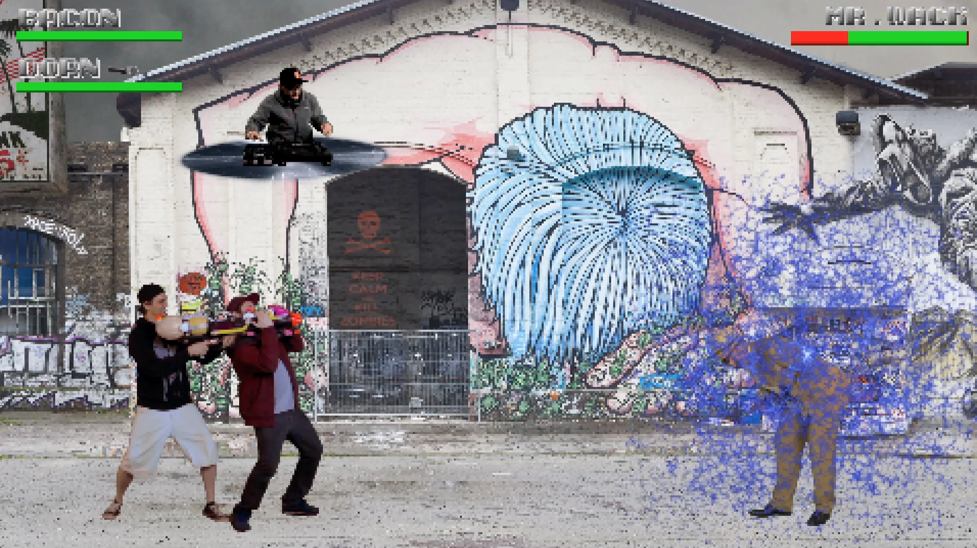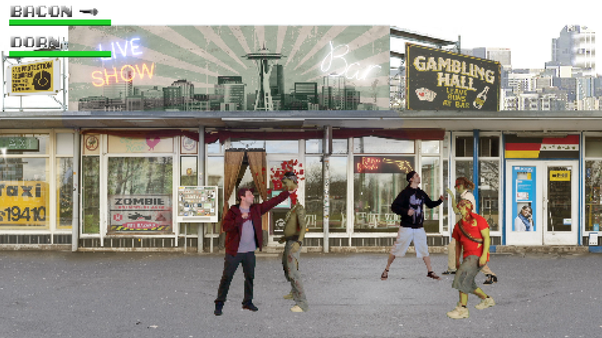 "Guys, there's beef in the hallowed halls of Rap! The greedy Dr. Wack has sent out his brain-eating army to transform each tight Mc of this earth into a Rap-Zombie! " So far the background story of the new music video " Zombie Nation " by the hip-hop crew Bacon & Dorn ( Würzburg / Berlin ). But there is hope! In " Zombie Nation " Bacon & Dorn are facing the rap zombies to save your ears. With Philo Philta and Fränk SIDATA ( Sicksteez ) they have two of Würzburg's best Hip-Hop artists with them. So they are equipped with beats and cuts to face the undead. It's all about rap and that`s where the fun stops ! So let`s grab Machette, Clock and Chainsaw, pump a killer beat and kille the Rap-Zombies 8-bit style . Realisation / Postproduction: Martin Hofmann (Mind & Image Manipulation, Berlin) Regie: Dani, Screendesign: Edvin Osvath, Jos Büro für Gestaltung