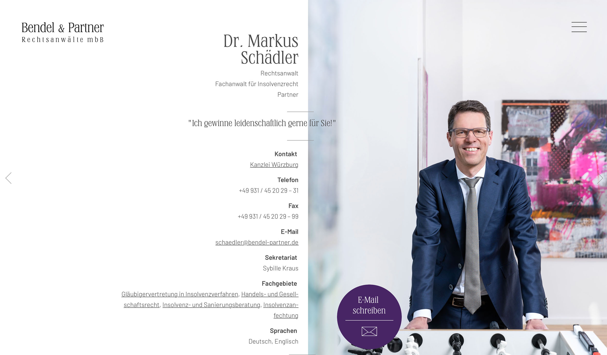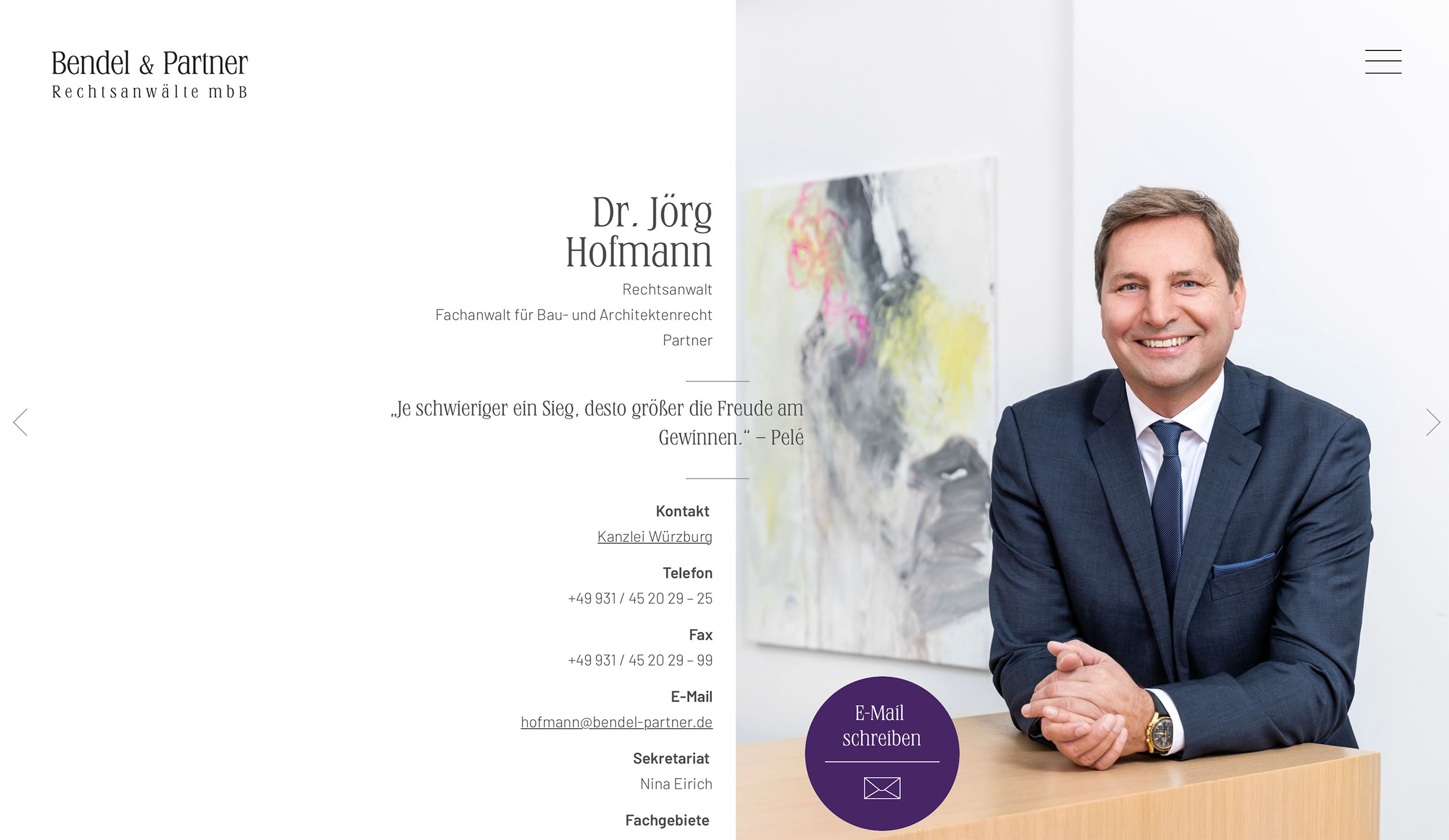 Die Wirtschaftskanzlei Bendel & Partner Rechtsanwälte mbB steht seit Jahrzehnten für fundierte juristische Beratung, unternehmerisches Denken und höchste fachliche Kompetenz. Mit Standorten in Würzburg, Schweinfurt und München berät die Kanzlei Unternehmen, Kommunen und Privatpersonen bundesweit in zentralen Fragen des Wirtschaftsrechts.